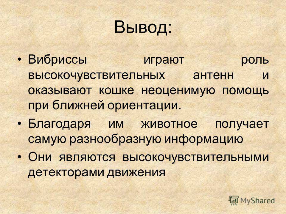 Вывод: Вибриссы играют роль высокочувствительных антенн и оказывают кошке неоценимую помощь при ближней ориентации. Благодаря им животное получает самую разнообразную информацию Они являются высокочувствительными детекторами движения