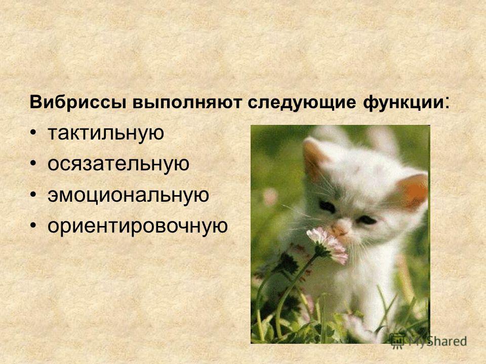Вибриссы выполняют следующие функции : тактильную осязательную эмоциональную ориентировочную