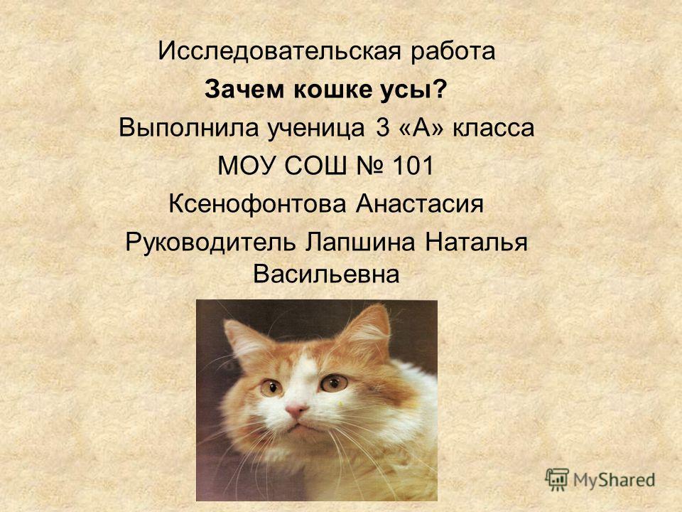 Презентация 3 класса на тему: “Исследовательская работа Зачем кошке усы? Выполнила ученица 3 «А» класса МОУ СОШ 101 Ксенофонтова Анастасия Руководитель Лапшина Наталья Васильевна.”. Скачать бесплатно и без регистрации. — Транскрипт: