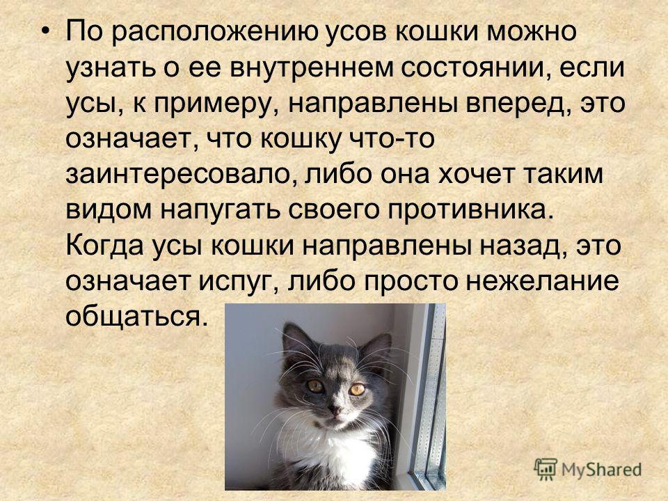 По расположению усов кошки можно узнать о ее внутреннем состоянии, если усы, к примеру, направлены вперед, это означает, что кошку что-то заинтересовало, либо она хочет таким видом напугать своего противника. Когда усы кошки направлены назад, это означает испуг, либо просто нежелание общаться.