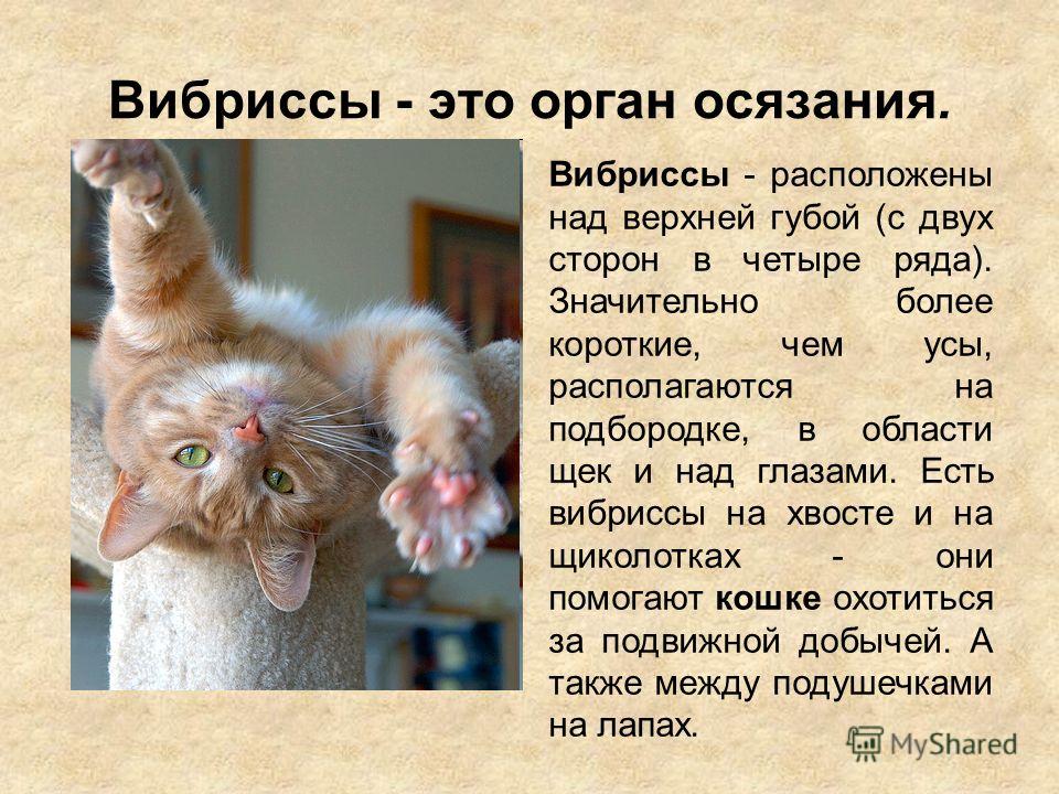 Вибриссы – это орган осязания. Вибриссы – расположены над верхней губой (с двух сторон в четыре ряда). Значительно более короткие, чем усы, располагаются на подбородке, в области щек и над глазами. Есть вибриссы на хвосте и на щиколотках – они помогают кошке охотиться за подвижной добычей. А также между подушечками на лапах.