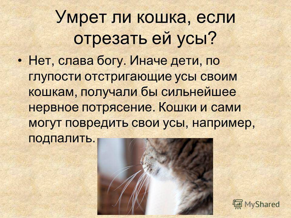 Умрет ли кошка, если отрезать ей усы? Нет, слава богу. Иначе дети, по глупости отстригающие усы своим кошкам, получали бы сильнейшее нервное потрясение. Кошки и сами могут повредить свои усы, например, подпалить.